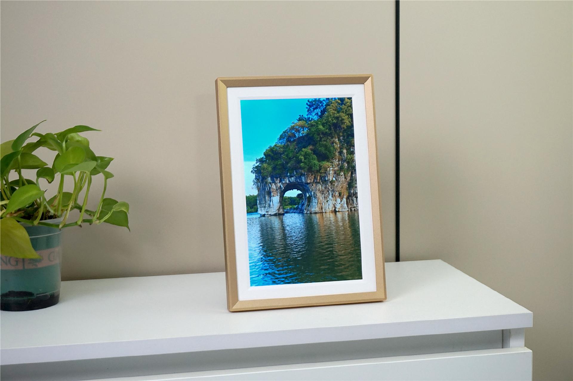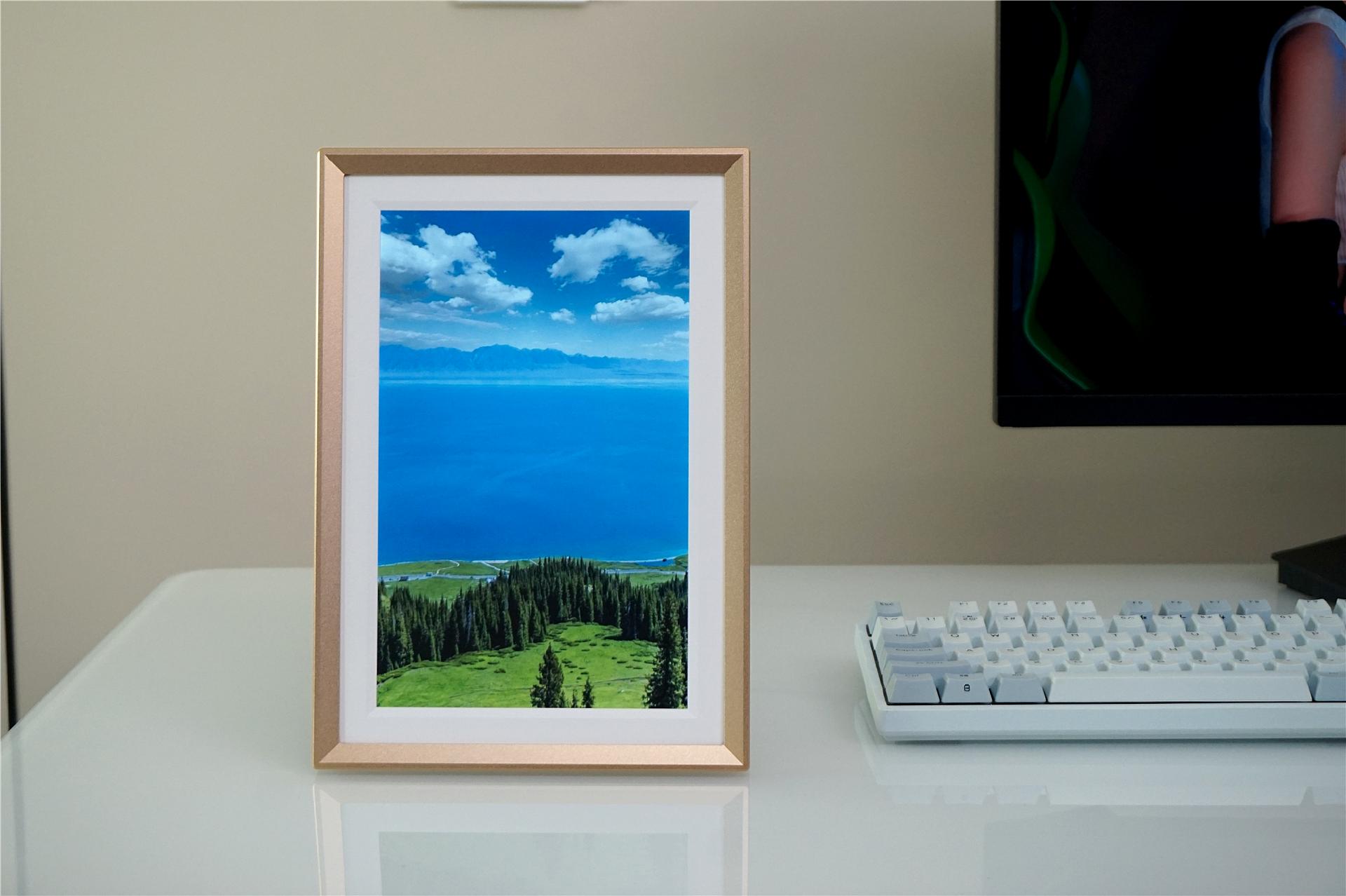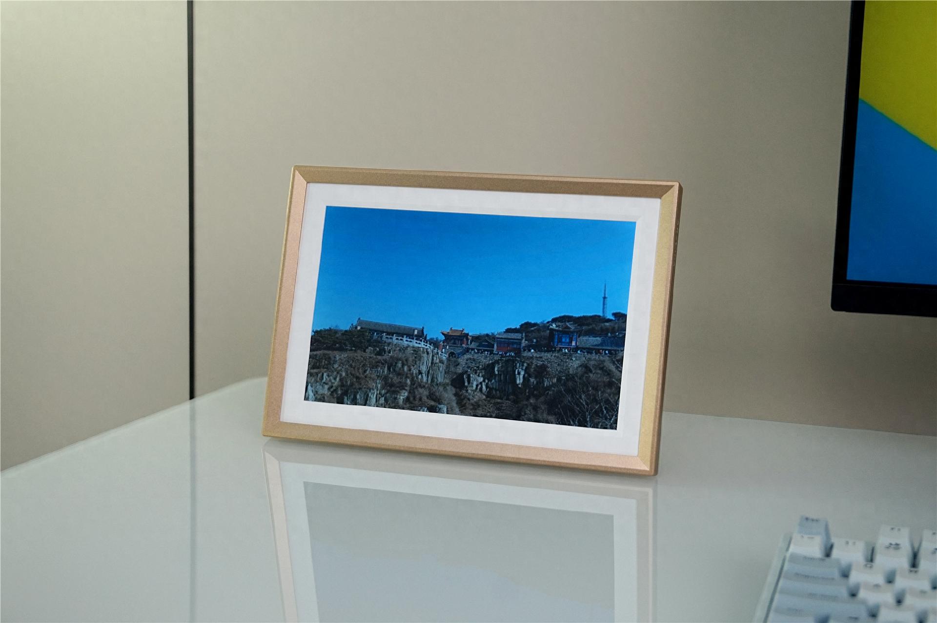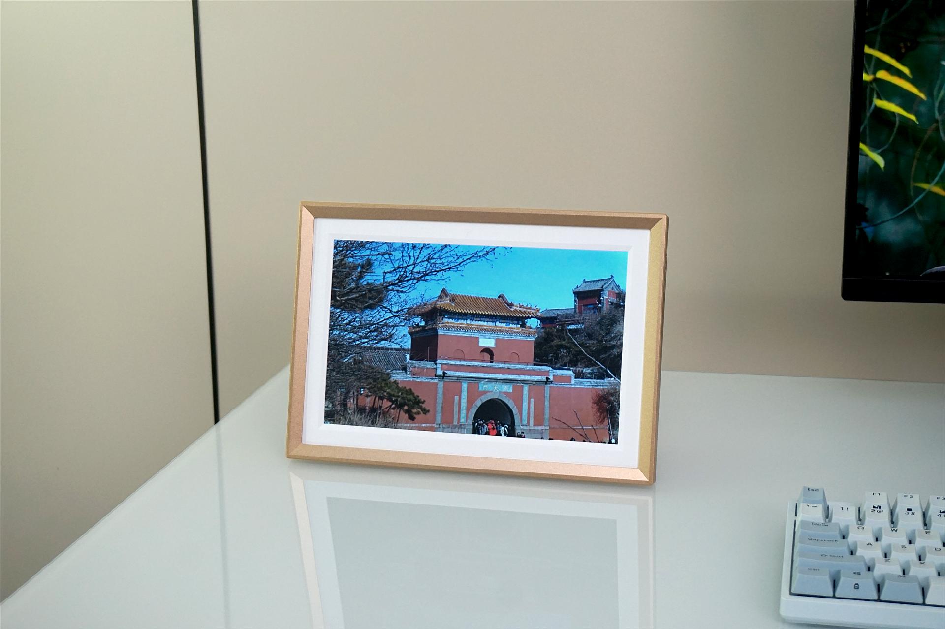 ARZOPA D10刚拆箱时,就颠覆了我对数码相框呆板笨重的固有印象。它的整体设计极具辨识度,采用了百搭时尚的香槟金金属外框,金属材质的质感细腻,边缘打磨得圆润光滑,没有丝毫毛刺感,轻轻触摸就能感受到品质感。