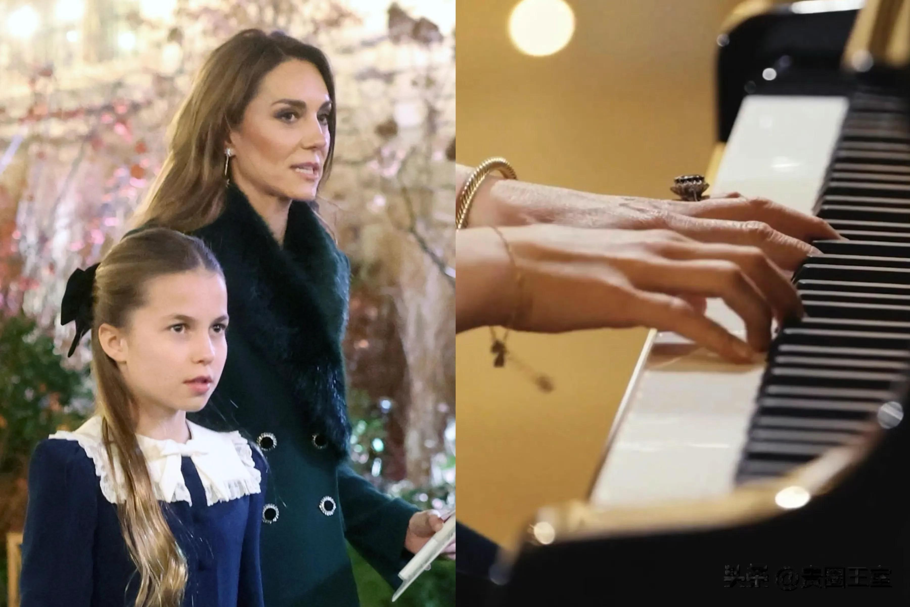 在官方视频中,凯特王妃手上佩戴的蓝宝石钻戒引人注目。随后,夏洛特公主也加入演奏,与母亲共同弹奏,画面温馨动人。