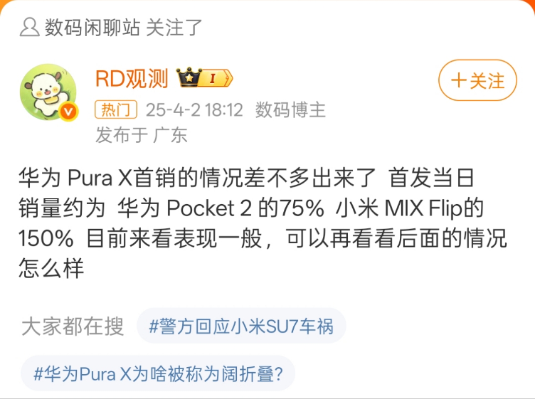 对此有数码博主RD观测发文称,华为Pura X折叠屏手机,首销量为华为Pocket2的75%,小米MIX Flip折叠屏手机的150%。