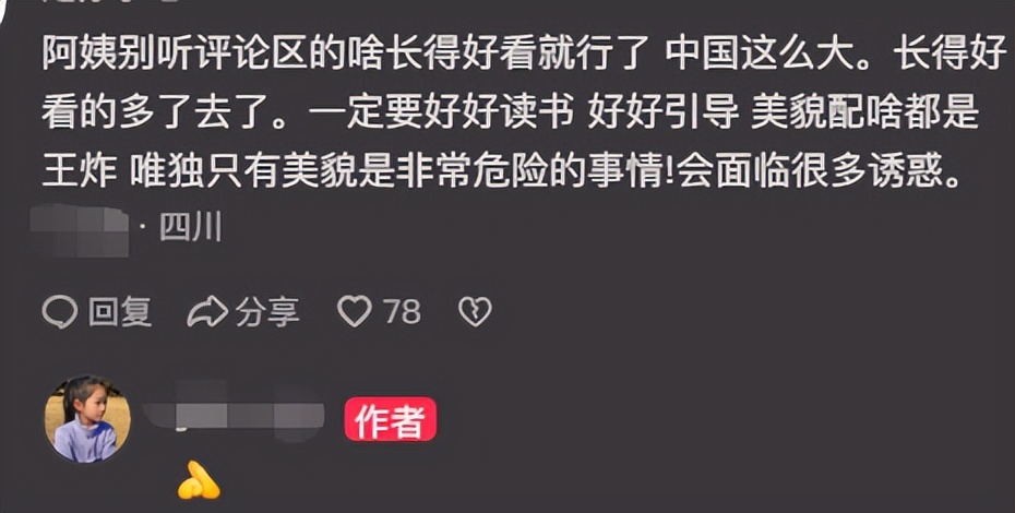 没有经过好好引导,她只有美貌将会是非常危险的事情,以后这个学生遇到很多诱惑的时候,那些网友们能够承受这个代价,或者是引人走入歧途的损失吗。