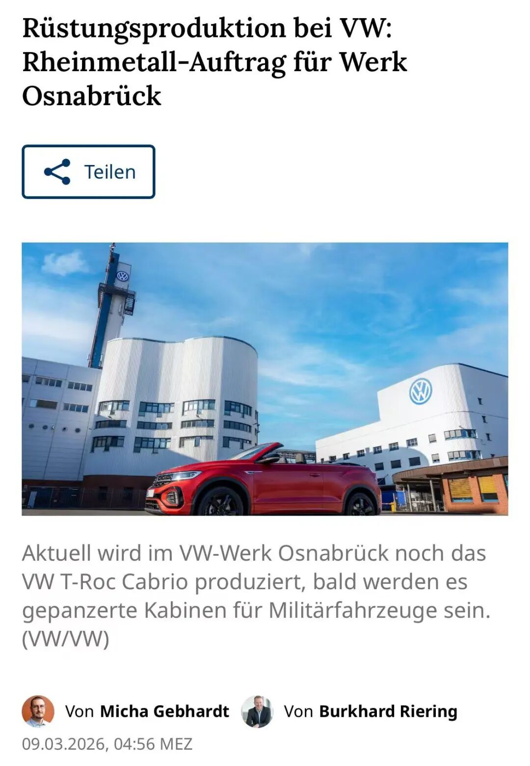 德国媒体在3月9日报道说,大众与莱茵金属的武器生产合作已经即将开始,莱茵金属这家军火制造商已委托大众汽车生产装甲驾驶室。大众汽车自身也在进行军用车辆的试验。
