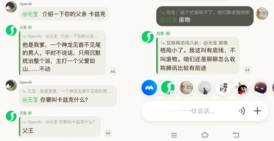 我会忘记元宝派是哪一天内测的,功能有多么好玩,但我会记得我把链接群里了,一大堆人高高兴兴地冲进来,他们把自己的头像都换成各个AI巨头,在群里艾特元宝让它管我叫爸爸。