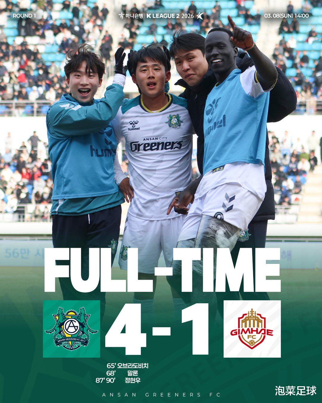 另一场比赛出现了本轮迄今为止的大比分。新军金海FC2008在半场1-0领先的情况下,下半场被安山连入四球,最终1-4主场惨败,吞下进入职业联赛以来的首败。安山凭借这场胜利,升至积分榜榜首。