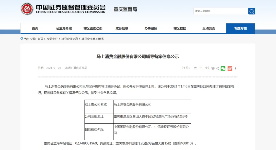 记者了解到,马上消费金融早在5年前就与保荐机构签订辅导协议,拟公开发行股票并上市,但至今未正式申报。据重庆证监局网站披露,该公司2021年1月份办理辅导备案登记,辅导机构为中国国际金融股份有限公司、中信建投证券股份有限公司。