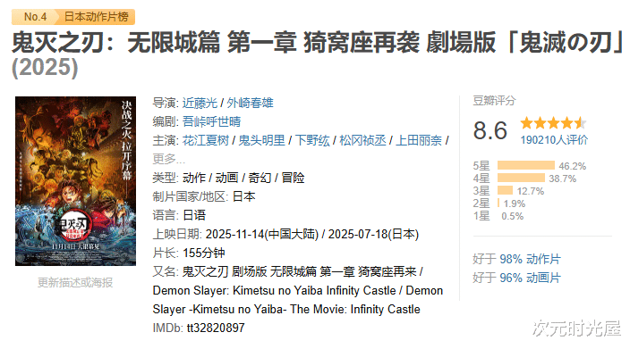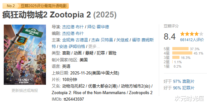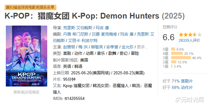 居然击败了豆瓣评分8.4分的《疯狂动物城2》和8.6分的《鬼灭之刃 剧场版 无限城篇 第一章 猗窝座再来》,而《K-POP:猎魔女团》自己却只有6.6分,这……有知道评分规则的同学吗?可以站出来说两句!