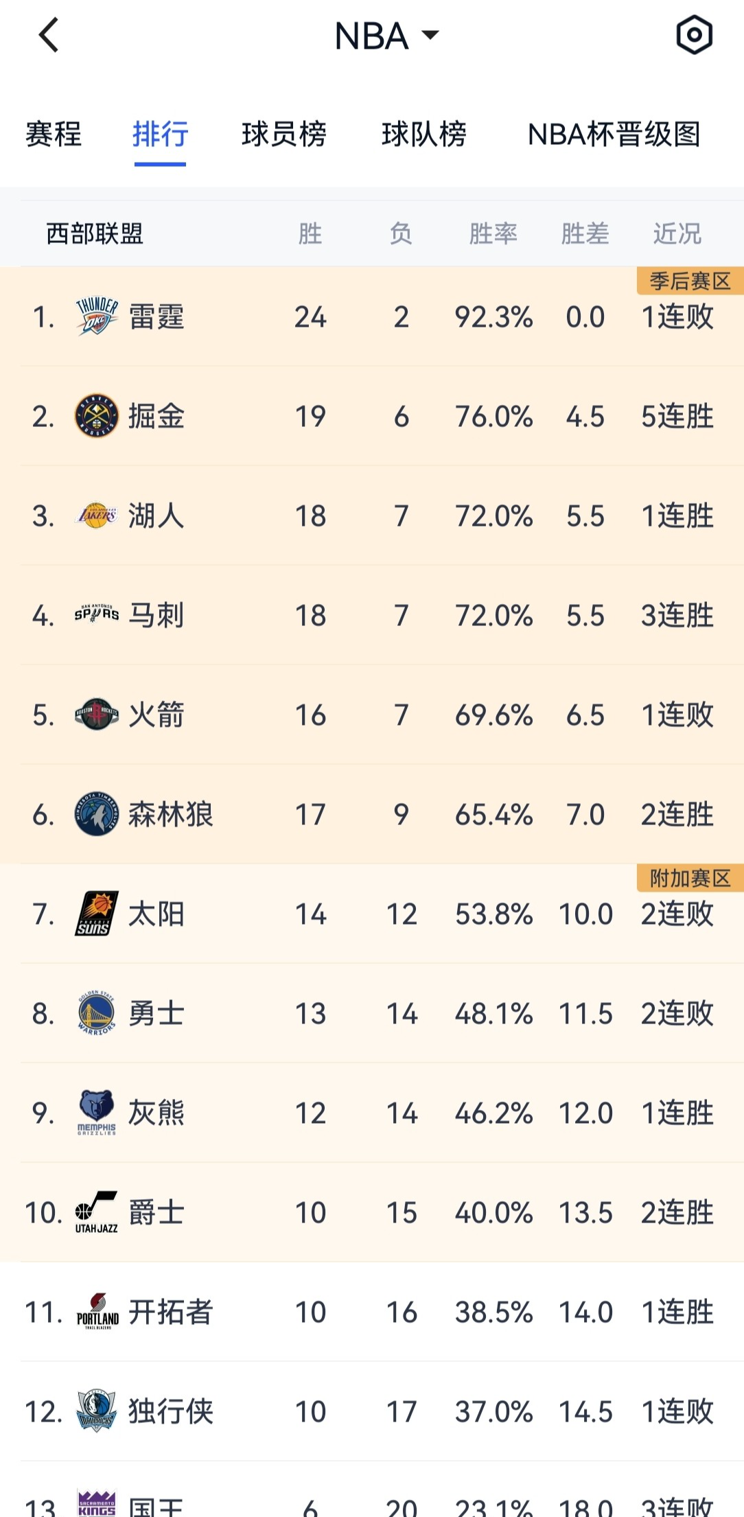 NBA常规赛西部赛场迎来一波大乱斗,三场焦点内战打完,西部排名直接来了个大洗牌。爵士加时掀翻独行侠,掘金险胜火箭豪取5连胜,灰熊轻取快船送其4连败,而没打比赛的湖人则坐收渔利,顺势攀升到西部第四的位置,西部从上游争冠区到下游垫底区的竞争,这下变得更有看头了:
