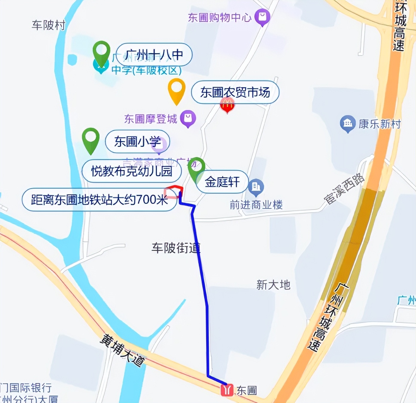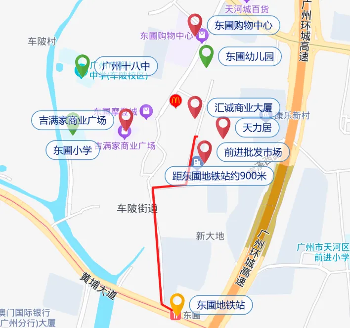 距离地铁5号线东圃站约900米,学校是东圃幼儿园、小学和广州十八中。