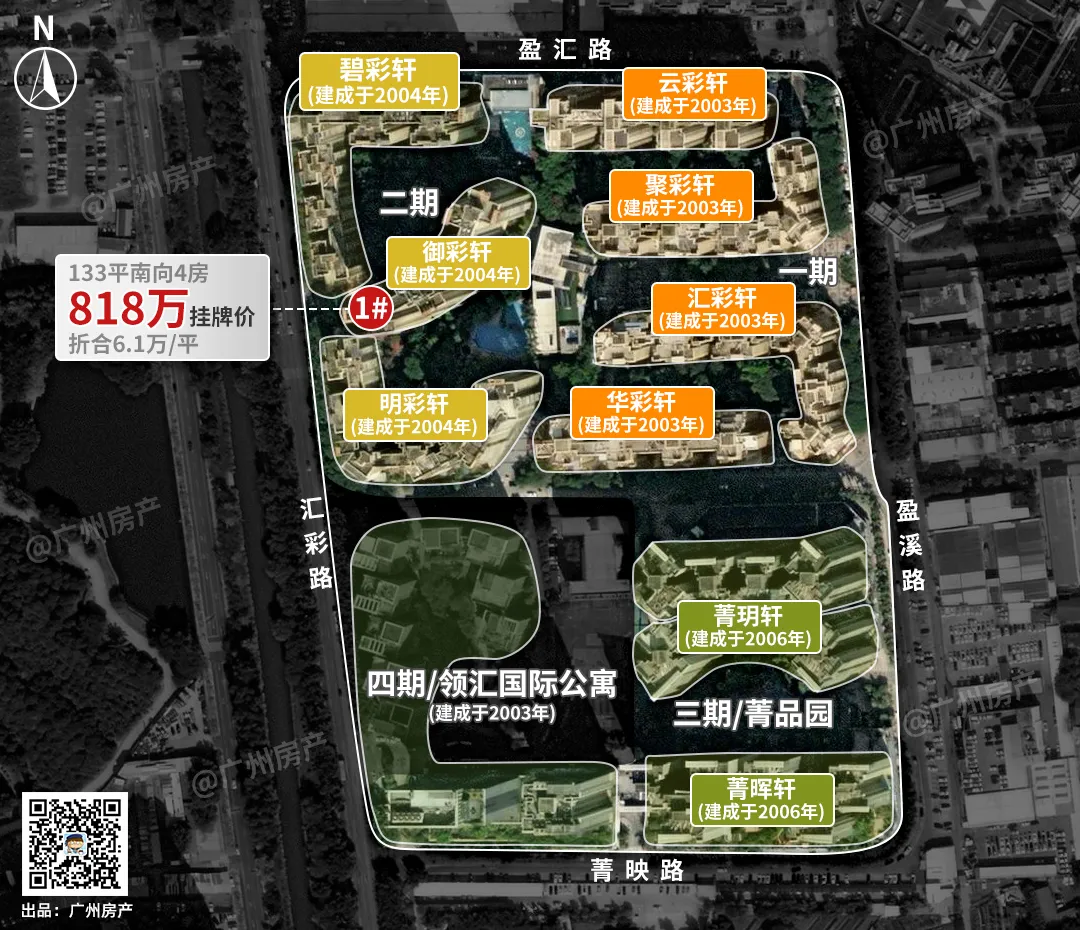 盈彩美居分四期开发,建成于2003-2008年,共47栋楼、3800多户,容积率2.88,绿化率30%。