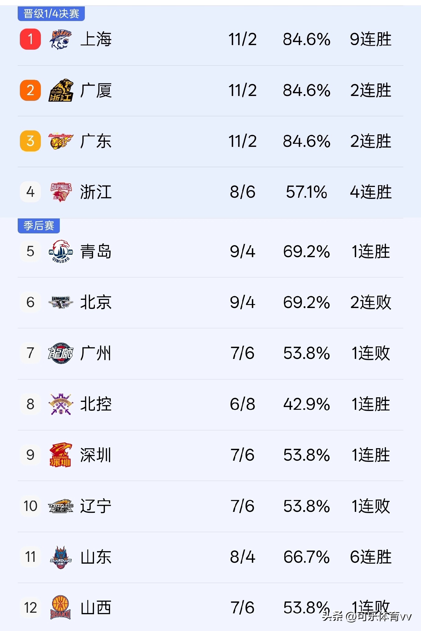 随着比赛全部结束,CBA最新积分榜出炉:1-4名为上海、广厦、广东、浙江。5-12名为青岛、北京、广州、北控、深圳、辽宁、山东、山西。其中,四川惨遭14连败队史最差,排名倒数第二,仍然一胜难求!江苏则1胜12负排名垫底,形势不容乐观!