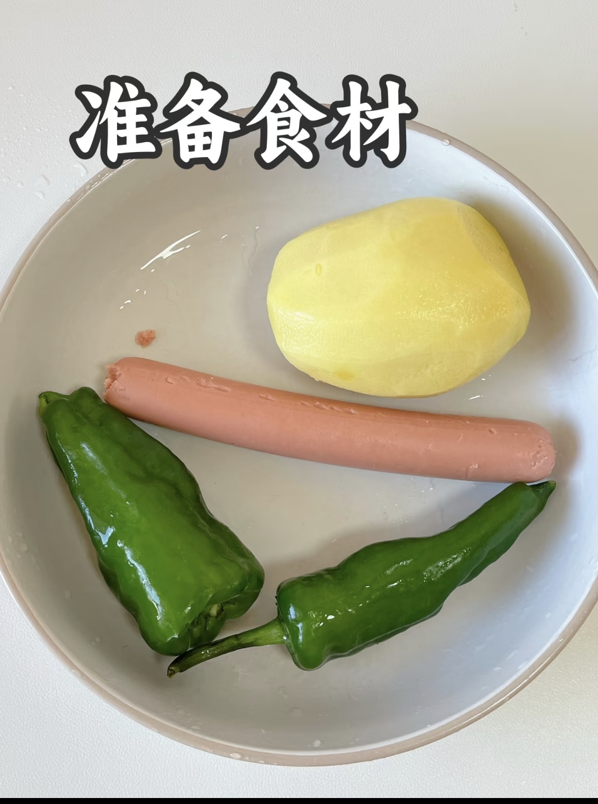 这道饭的食材特别家常,家里基本都有。准备一个中等大小的土豆,去皮切成小丁,尽量切得均匀一点,这样熟得快。一个青椒,切成小块,喜欢辣的可以带点辣椒籽。再准备一小块火腿,也切成丁。如果家里有洋葱,可以切一点洋葱丁,炒出来更香。最后准备一点蒜末,提味用。