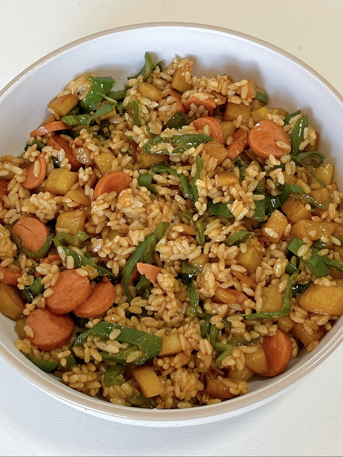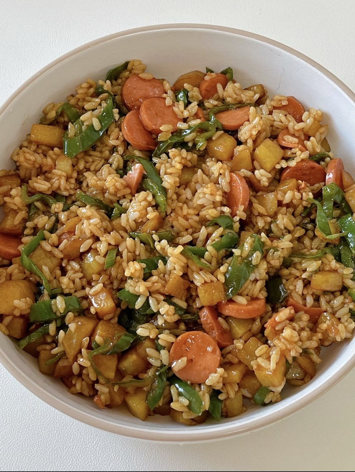 把炒好的青椒火腿土豆铺在热腾腾的米饭上,用勺子搅拌均匀,让每一粒米饭都裹上酱汁。一口下去,土豆的绵软、青椒的清脆、火腿的咸香在嘴里交织,酱汁的味道更是点睛之笔,咸鲜适口,回味无穷。这道饭不仅好吃,还特别健康,土豆提供了碳水,青椒提供了维生素,火腿提供了蛋白质,几分钟就能搞定一顿营养均衡的美味,简直是太棒了。