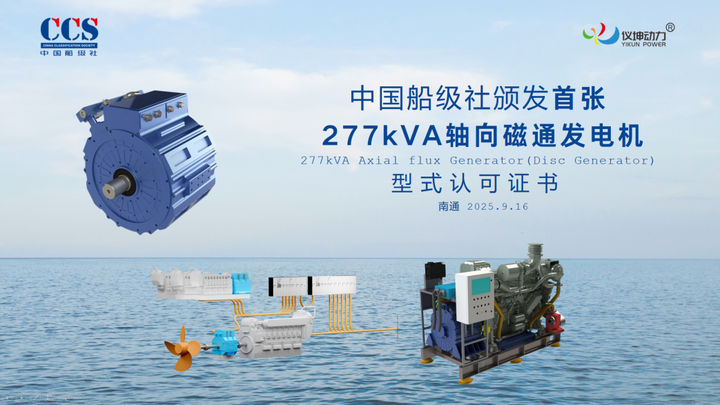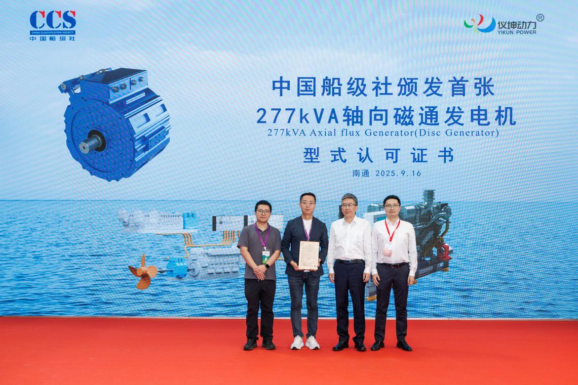 多年来,仪坤动力与中国船舶集团等国内领先海工企业深度合作,持续深化产品船用化设计与验证流程。该轴向电机采用航海专用铝合金材质打造,依托特殊结构设计与精密密封工艺,先后完成军工级可靠性验证及各类苛刻环境测试,顺利通过8500V耐压与绝缘性能电老化测试。其配套的海水冷却发电机组,亦完成全面环境适应性验证,具备优异的防水、防潮、防腐蚀性能,可确保在复杂多变的水上环境中稳定、可靠、持久运行。基于以上高标准设计、精细化研制及全流程严苛测试,仪坤动力的轴向磁通电机成功斩获中国船级社颁发的国内首张型式认可证书。