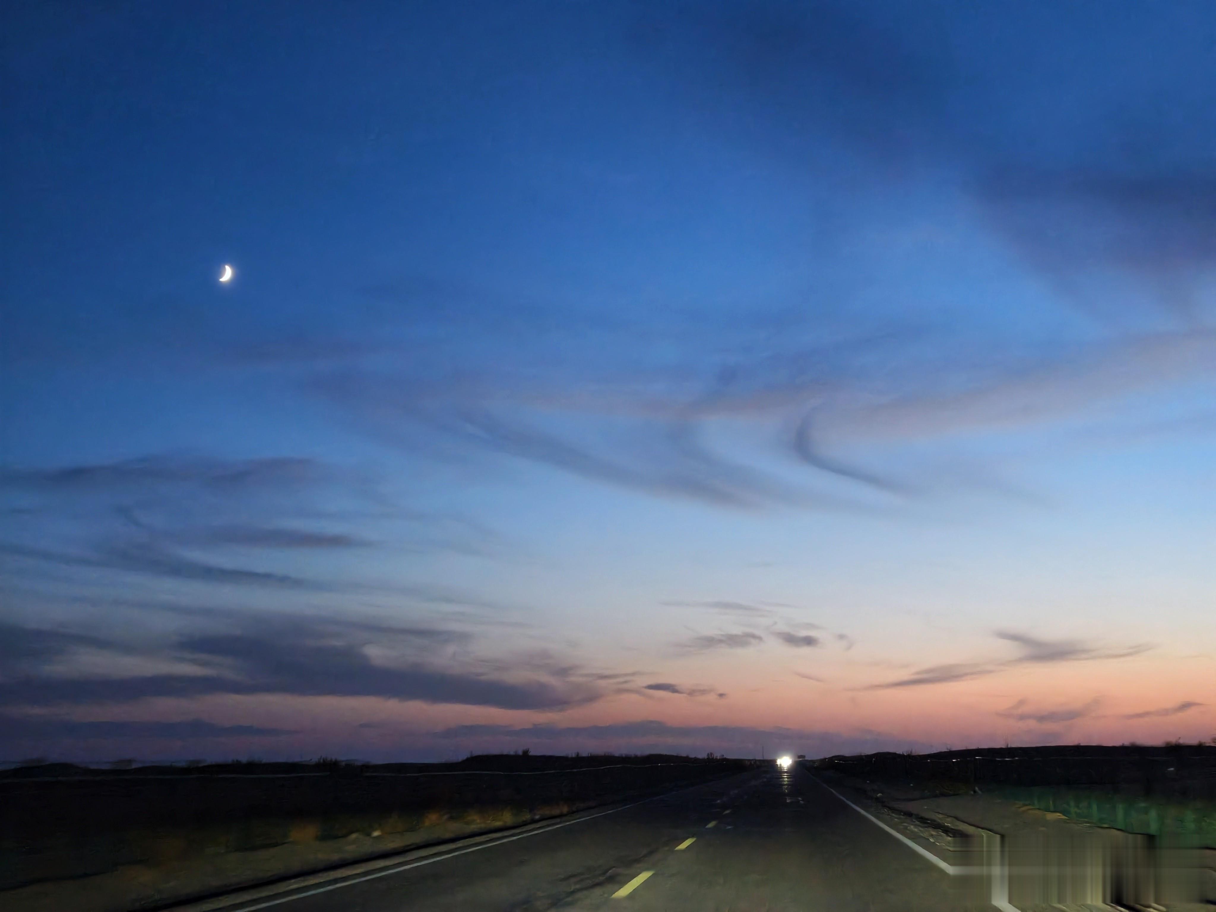 日落之后一直在前方陪伴我们的一轮弯月,让夜幕中的最后一段路程充满了浪漫与温暖。
