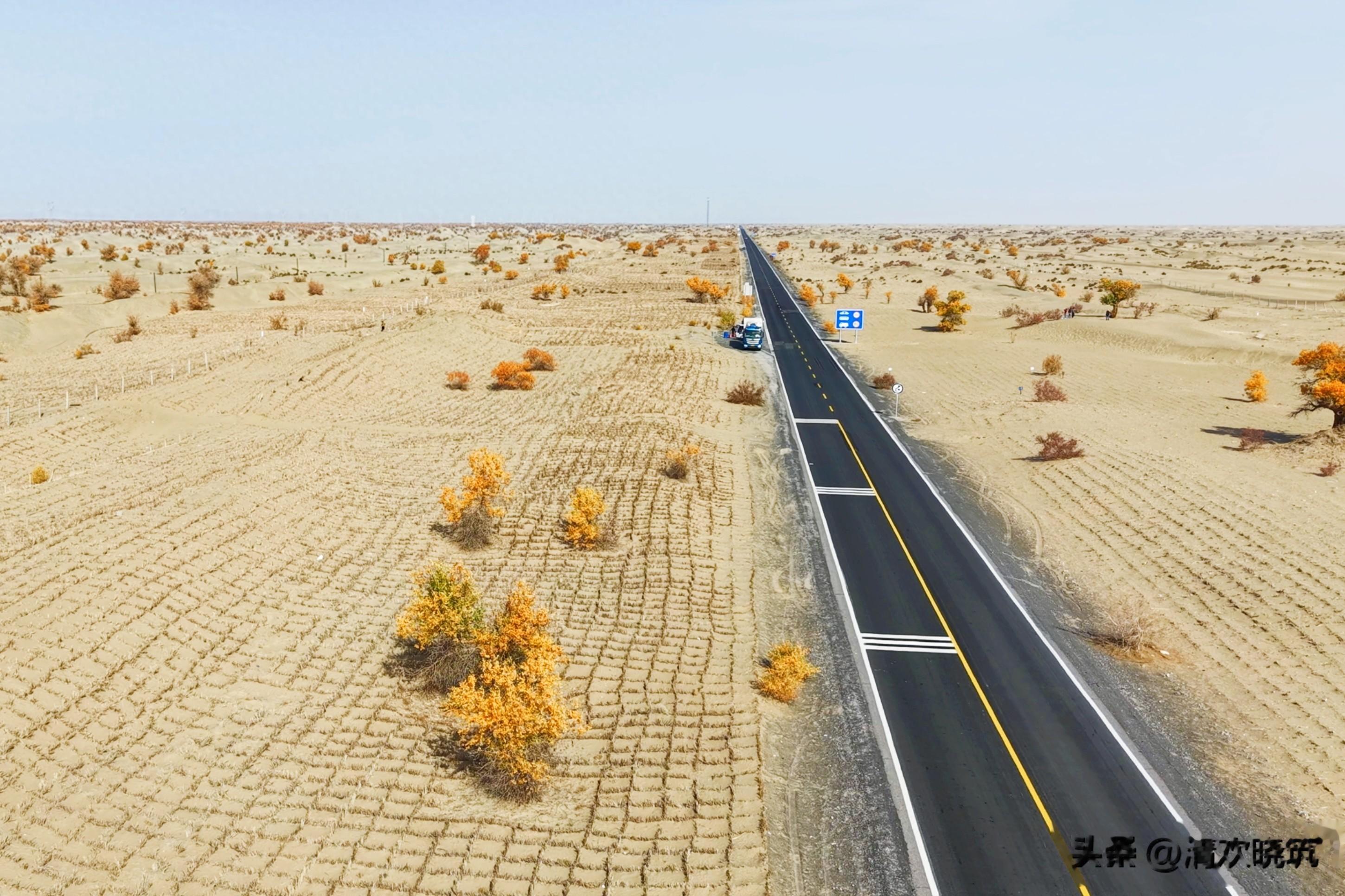 当你驾驶车辆奔驰在这条公路上时,除了两边的沙坡,还有一闪而过的金色胡杨树,蚂蚁视角的我们根本感觉不到是行驶在浩瀚无际的沙漠里的。