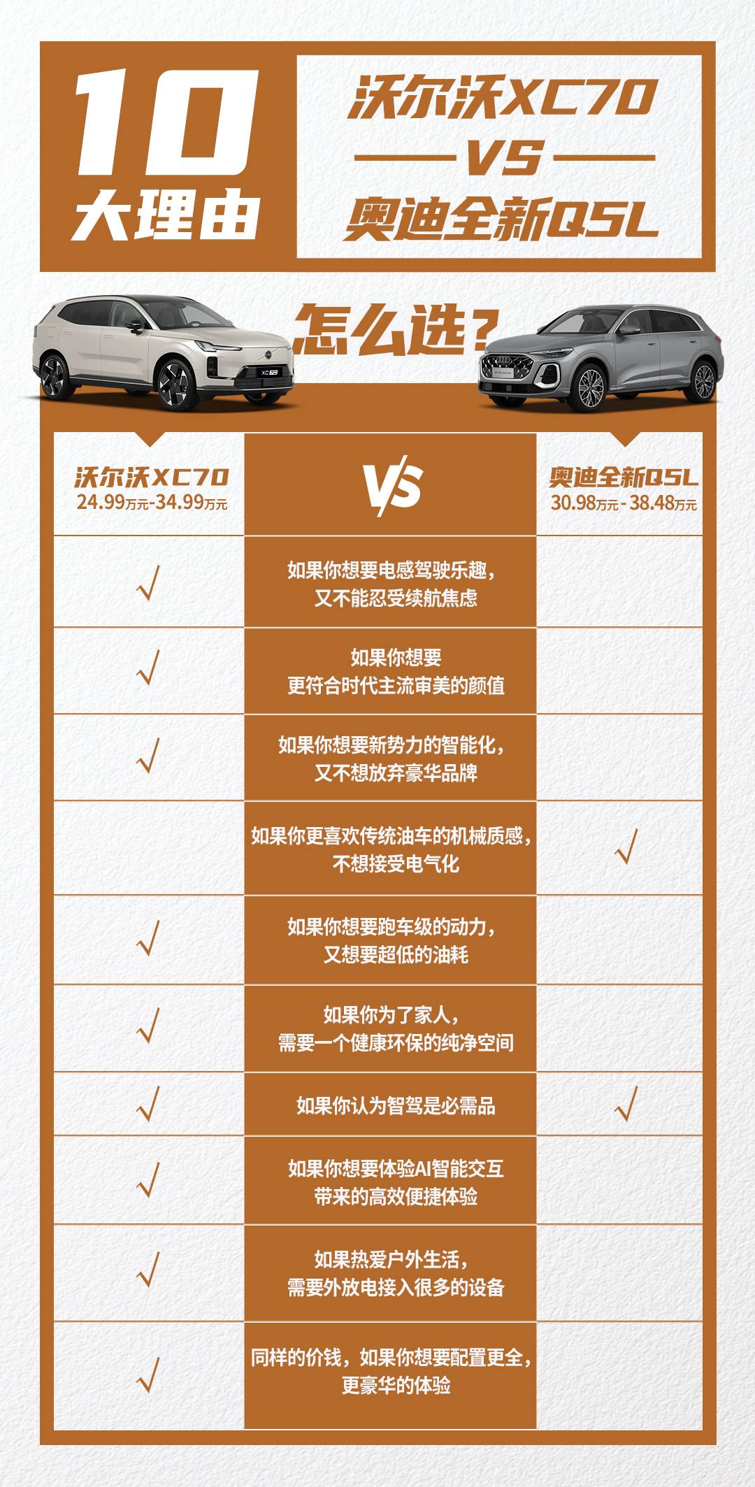 这样来说吧,我们买豪华SUV,无非就是为了两点,一是面子、二是自己的体验。从对比来看,沃尔沃全新XC70和全新奥迪Q5L,它们都是主流豪华品牌的产物,面子属性都没差。但在对自身的体验上,全新XC70实现了更为彻底的电气化转型,从设计质感到智能表现再到动力效率,都要比传统燃油车领先一个时代,而且还有实打实的购车成本优势。这样来看,大家知道三十万级豪华SUV如何选了吧?