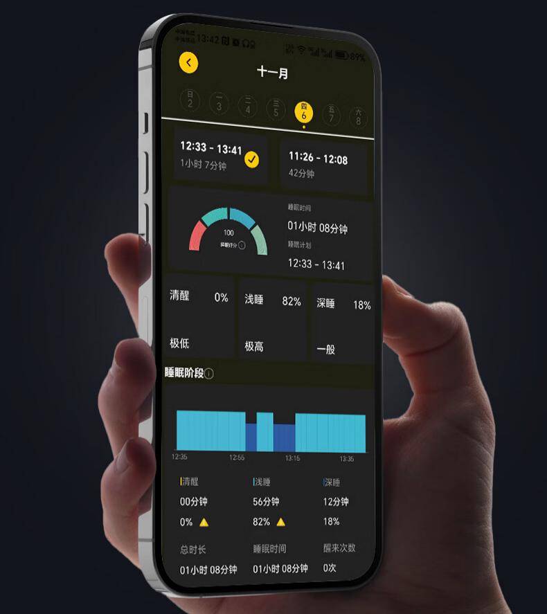 在降噪方面,它采用三层仿生消噪腔、分频降噪引擎和双耳麦阵列,能够分段抑制呼噜声、谈话声、空调声甚至街道噪音,入耳前就先降低干扰,就像置身安静的小屋。结合APP智能算法,耳机还能监测整晚睡眠状态,自动识别深睡、浅睡和觉醒时间,入睡后停止播放,早晨轻柔唤醒,并生成完整睡眠报告,让每晚休息既舒适又可量化管理。