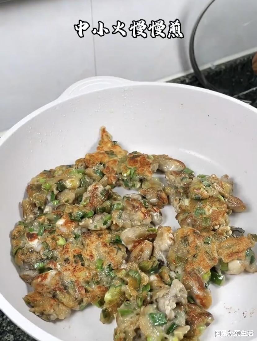 翻面是个技术活,如果怕散,可以借助盘子:先把海蛎煎滑到盘子里,再倒扣回锅中。另一面也煎2-3分钟,直到两面金黄。