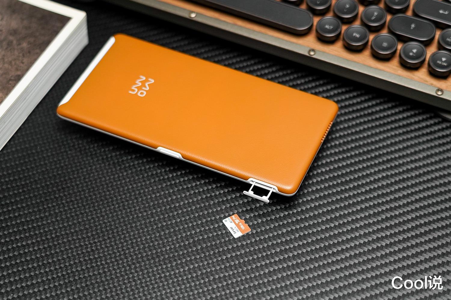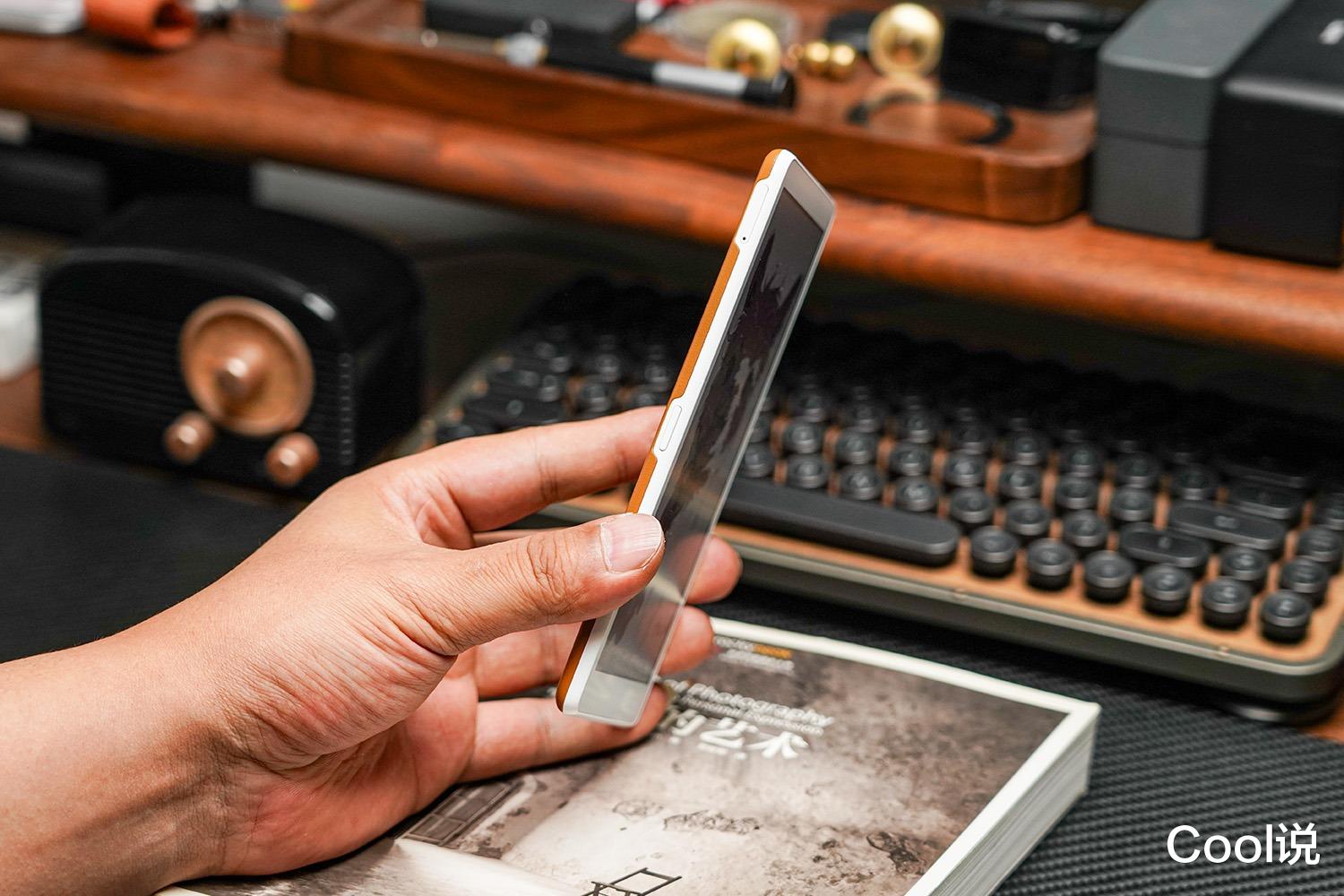 墨案Mini Ultra机身采用高复合材质打造,通过特殊精雕工艺呈现出类似素皮的纹理效果,官方命名为“褐玉”,按照视觉直观感受上“焦糖色”或“焦糖玛奇朵”感觉也很贴切。这种非素皮材质的硬质外壳,既保留了皮革的细腻质感,又具备轻盈与耐用性,重量仅145g,厚度控制在合理范围内,握持感舒适。