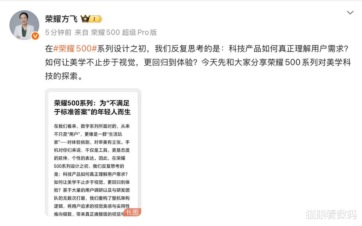 当然,荣耀500系列的亮相,意义不止于简单的曝光外观,更重要的是,通过高管解读,为产品做了权威定调。