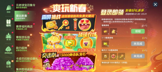 2月6日至3月1日,登录游戏即可获得海量资源,「霸屏门票」、「农场币礼包」、「农场月卡(7天)」、传说关键词「让我舔舔」、「宝石*15000」等丰厚豪礼上线即赠,不容错过。