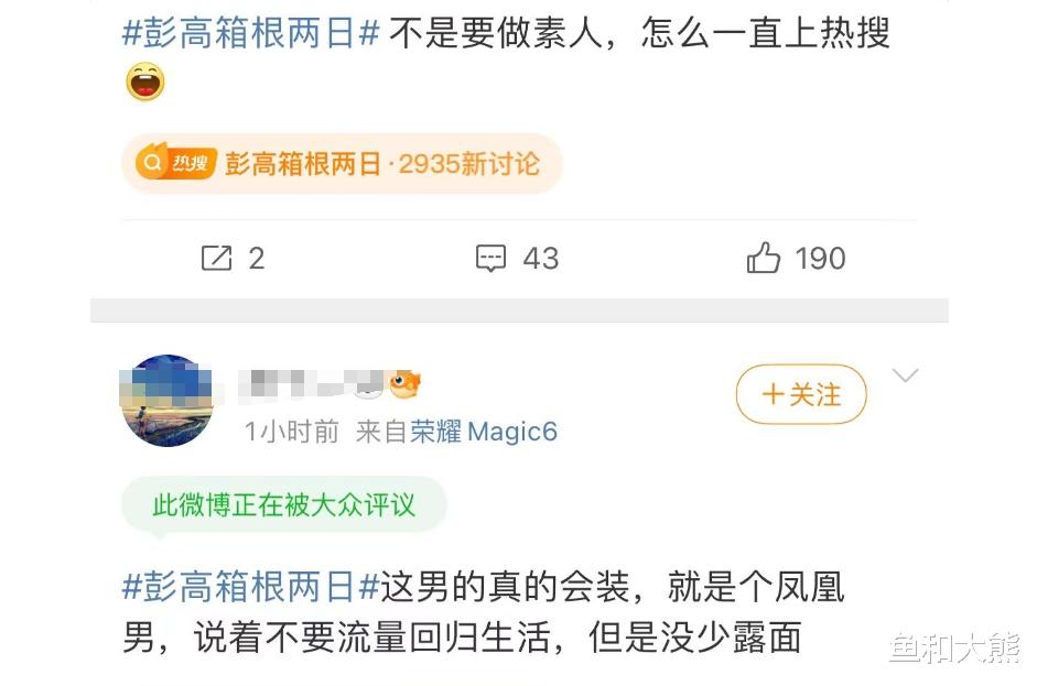 在很多网友看来,彭高当初迫不及待和翁青雅切割,应该就是想安静做个打工人,但如今顺利切割,自己却忍不住一再博关注,很难不让人怀疑想吃流量红利的是他。翻看彭高热搜词条评论区,超多网友涌现对彭高发起了吐槽,显然如果彭高后续真的辞职当网红,一定会遭到大规模反噬。