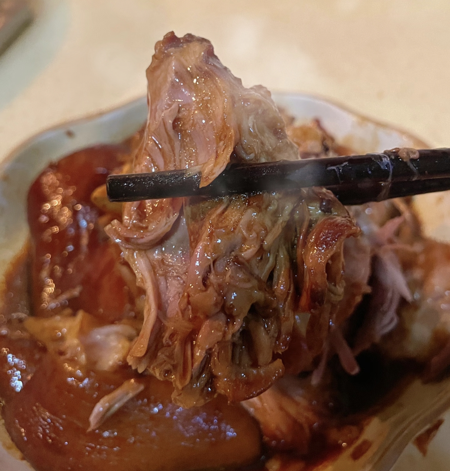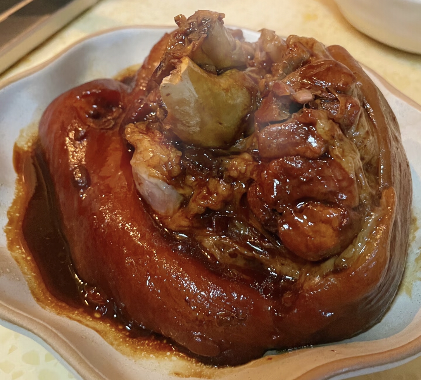 把肘子小心移到青花瓷盘里(没有就用大碗),淋上浓稠的酱汁,撒点葱花点缀。这时候可以学米其林大厨那样,用喷枪快速炙烤一下表面(没有就省略),瞬间激发出焦糖的香气。配上一碗晶莹剔透的东北大米,准备好迎接全家人的欢呼吧!