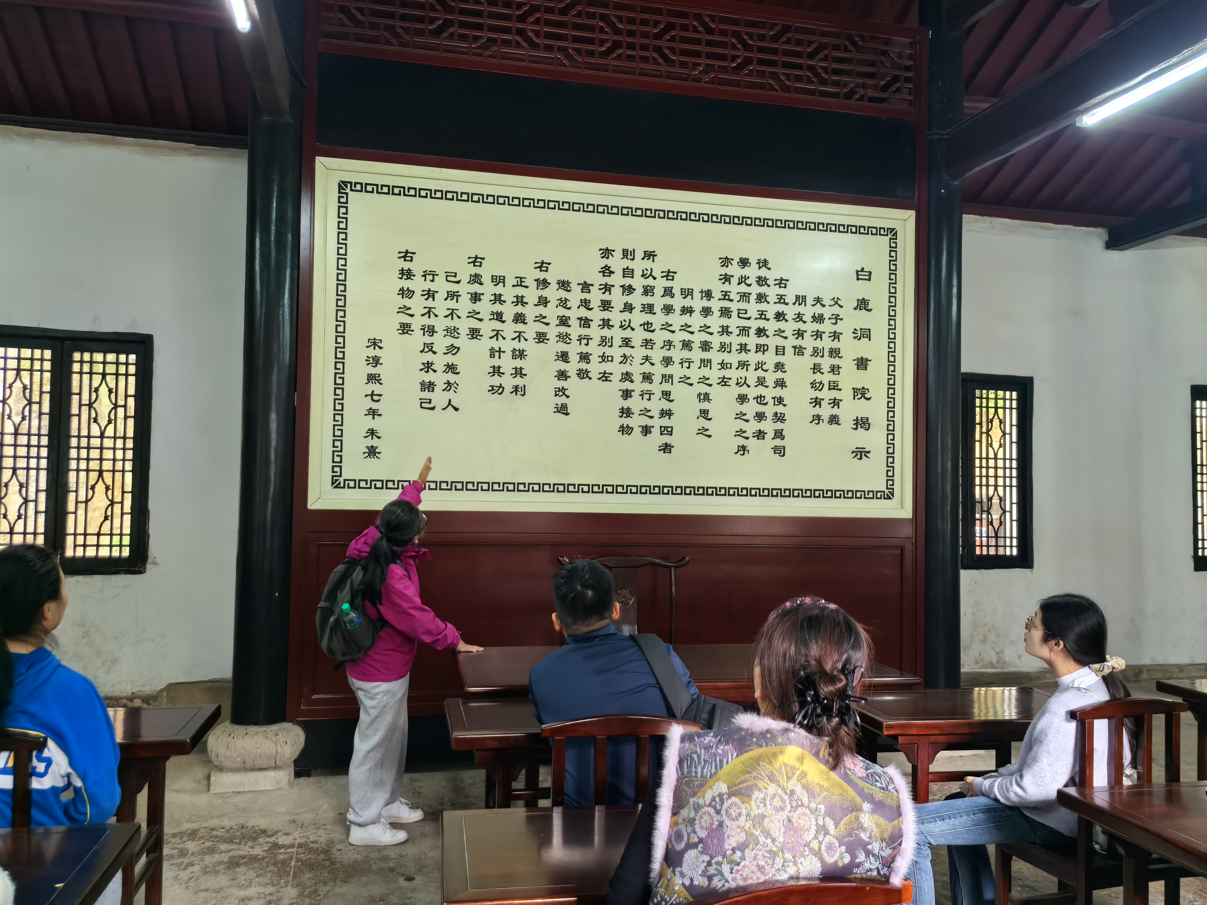 第三个院落是白鹿洞书院,也是白鹿洞书院的本院,是藏书、讲课、学生读书上课地方。其内部建筑有藏书阁、明伦堂、白鹿洞、思贤台。明伦堂是学生上课的地方,上面挂有朱熹亲自写的白鹿洞书院揭示,这个揭示浓缩了传统儒学和理学大成,教授学生学习待人接物的原则,陈述了教育的目的和原则。
