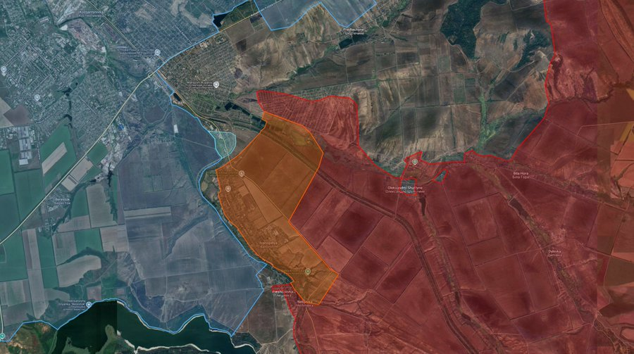 康斯坦丁尼夫卡方向,根据初步信息,伊万诺皮利亚已经完全落入俄罗斯控制之下。伊万诺皮利亚以北的灰色区域(浅蓝色)略有扩大。