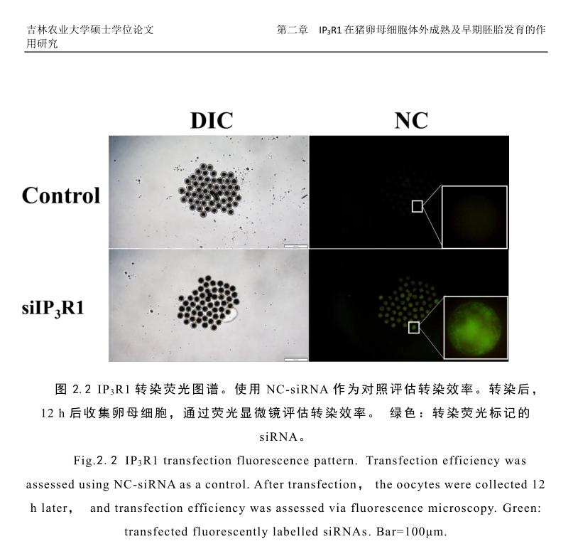 吉林农业大学研究者在IP3R1调控猪卵母细胞成熟及早期胚胎发育的作用研究课题中,为了进一步探究IP3R1干扰对猪卵母细胞体外成熟的影响,使用RFectSP悬浮细胞siRNA转染试剂将siIP3R1、NC -siRNA、带荧光标记的siRNA分别转染到猪卵母细胞中。荧光显微镜观察结果显示,转染的卵母细胞呈现绿色荧光,证实转染是有效的;用Western blotting 和qPCR分析IP3R1干扰后的蛋白和mRNA水平,发现IP3R1在干扰后的mRNA水平显著低于对照卵母细胞。Western blotting结果也证实了IP3R1干扰后蛋白表达量显著降低。