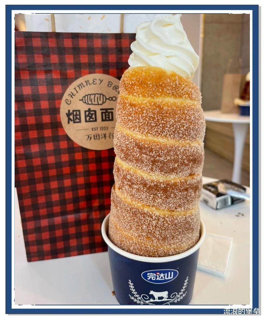 第六个就是烟囱面包,一个面包几十块,而且这么大一个是空心的,加满奶油再加20,大也不算太大,但是一个人吃不完,好看但不方便,当时好多人打卡排队,现在也有,就是到那就买,而且小店层出不穷,不知道真假!