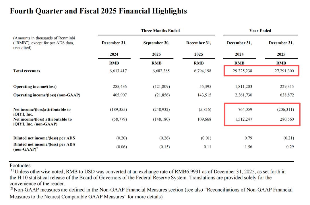 日前,爱奇艺发布2025年第四季度及全年的未经审计财务报告。