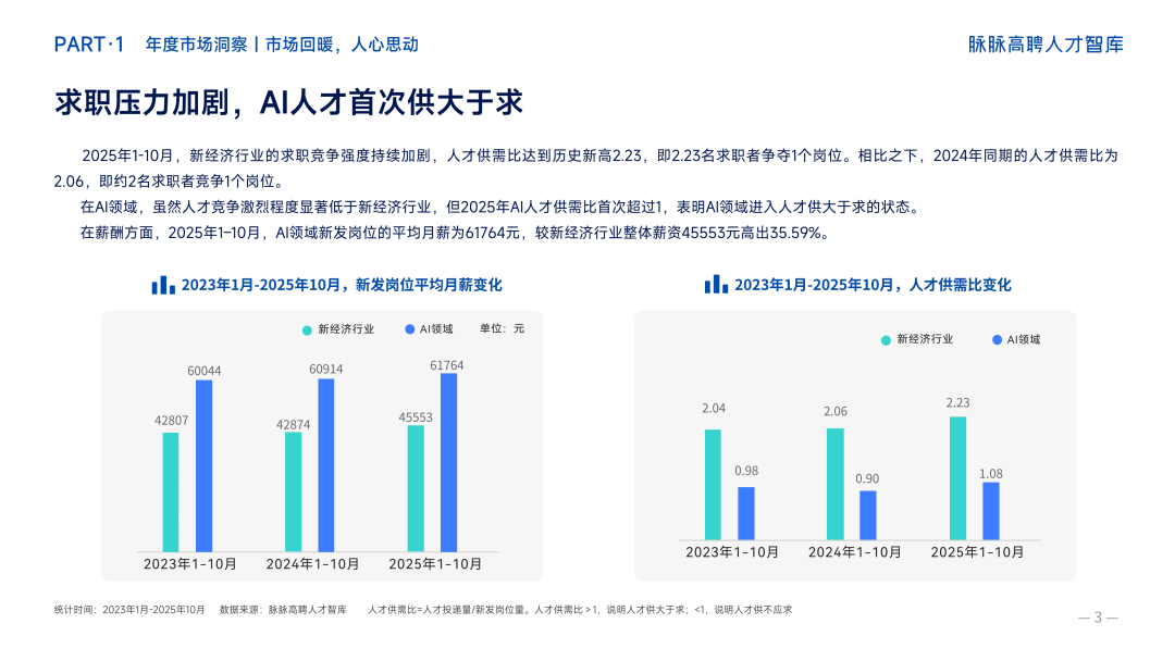 脉脉高聘人才报告显示,2025年1-10月,新经济行业的人才供需比达到历史新高2.23,即平均每个岗位有2.23名求职者在竞争。AI领域的人才供需比也在2025年首次超过1,达到1.08,标志着AI领域从人才供不应求转向供大于求。此外,报告同时显示,非 AI 专业工作中,也有将近五分之一的新发岗位,把AI能力作为明确要求:2025年1-10月,岗位JD中明确包含「AI」、「大模型」、「人工智能」等关键词的新发岗位占比达到19.18%,较2024年同期的12.25%提升约7个百分点。