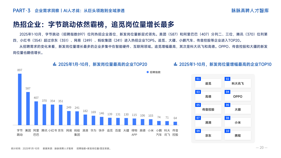 脉脉高聘人才报告显示,2025年1-10月,字节跳动(招聘指数897)位列热招企业首位,新发岗位量断层式领先。在AI人才热招企业榜单中,字节跳动同样以招聘指数111遥遥领先,小红书(53)、蚂蚁集团(43)紧随其后。2026届,字节校招开放超5000个岗位,研发类岗位同比增长23%,并启动Top Seed大模型顶尖人才校招计划,招募30位顶尖应届博士。