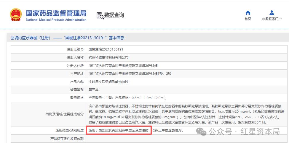 以李娜团队所使用的思伊美玻尿酸为例,红星资本局在该品牌官网以及国家药品监督管理局查询发现,该玻尿酸的注册证编号为“国械注准20213130191”,其适用范围和预期用途为“适用于面部皮肤真皮组织中层至深层注射,以纠正中重度鼻唇沟”。