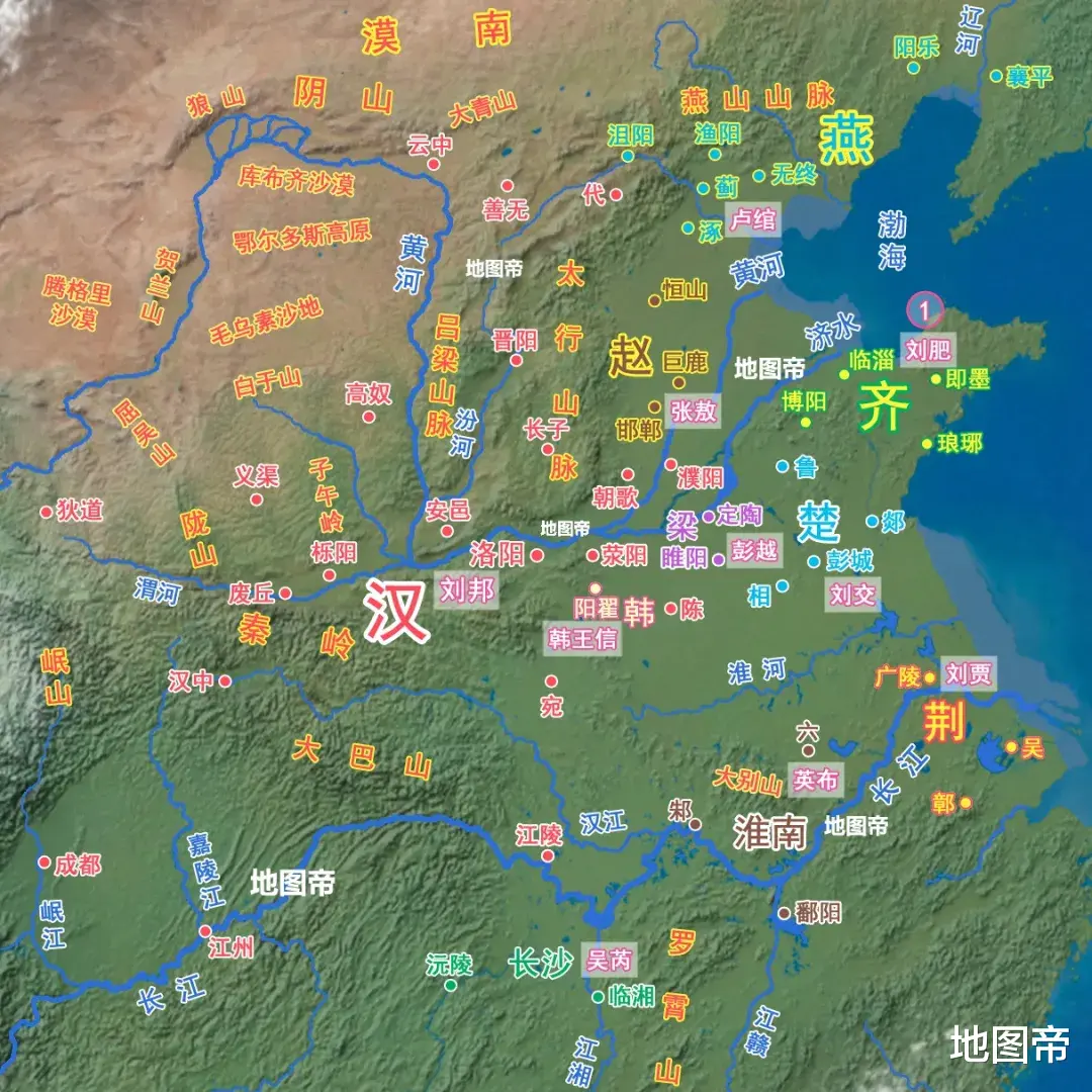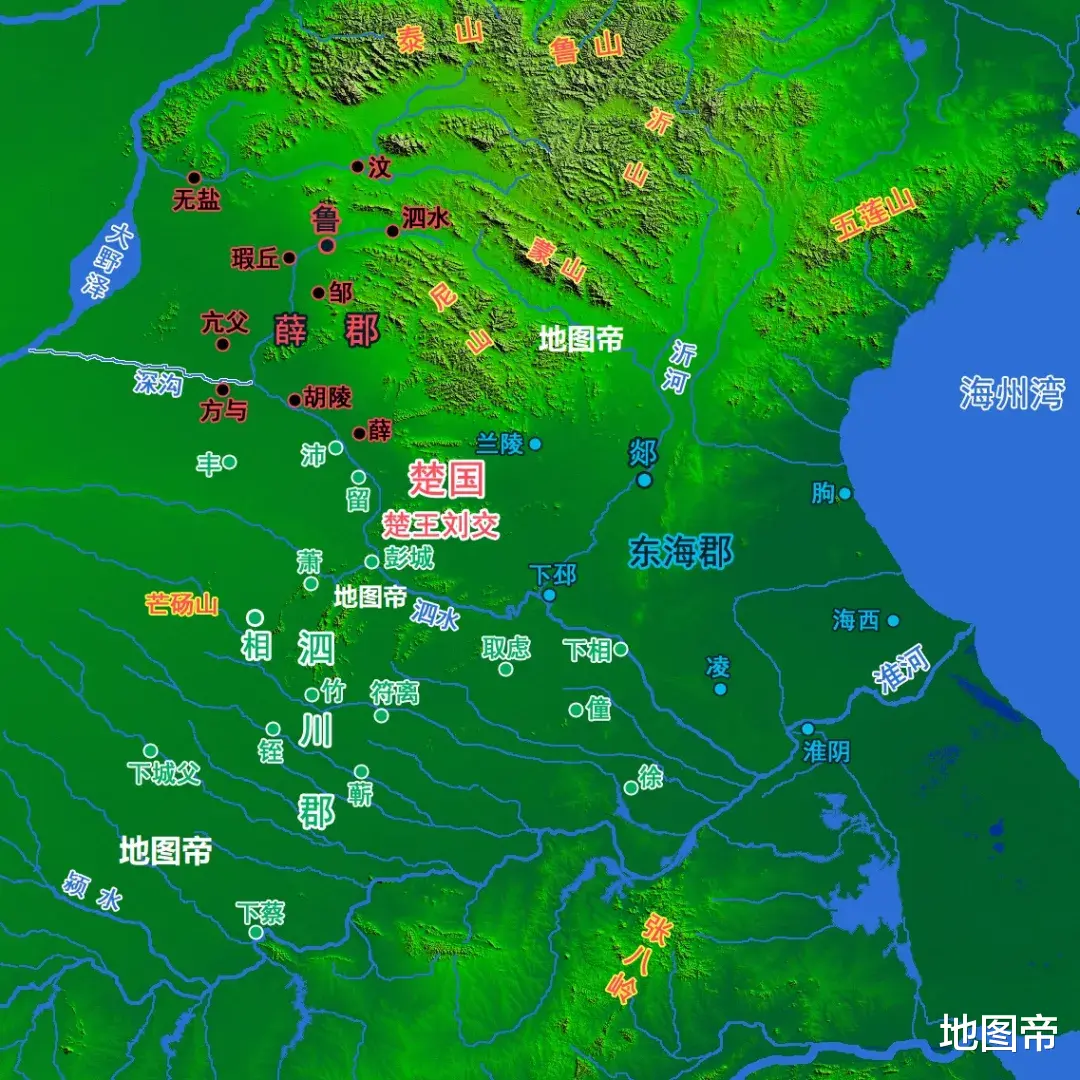 刘邦称帝后,以亲弟刘交为楚王,定都彭城,有三个郡,后分为五个郡(国),计三十六个县。