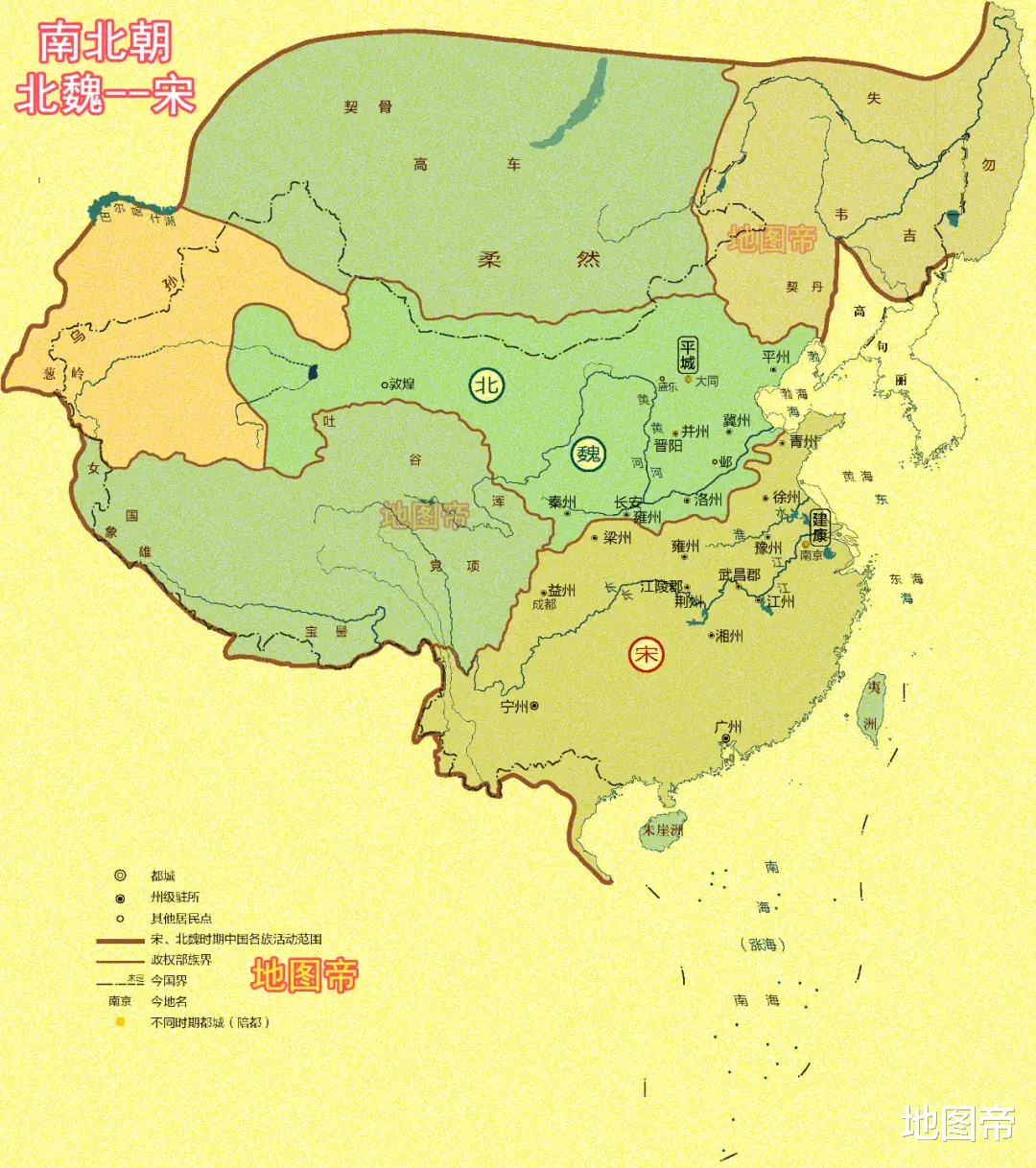 刘宋是南朝宋齐梁陈中面积最大的,所谓“七分天下而有其四”,比北宋不足,比南宋有余。南朝宋不仅牢牢控制秦岭-淮河一线,包括南阳、汝南、陈留、彭城(徐州),东北部还占据大半个山东半岛,西南部控制云贵高原、红河三角洲等地。