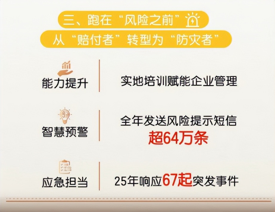 保险的本质在于风险管理,而其专业价值的深化,正体现在从“事后赔付”向“事前减量”的主动演进。泰康在线将资源与能力系统性投向风险发生的“上游”。2025年,通过动态风险监测系统,其全年向客户发送灾害、安全预警提示短信超64万条,并快速响应近67起突发事件,力求在损失扩大前实施有效干预。