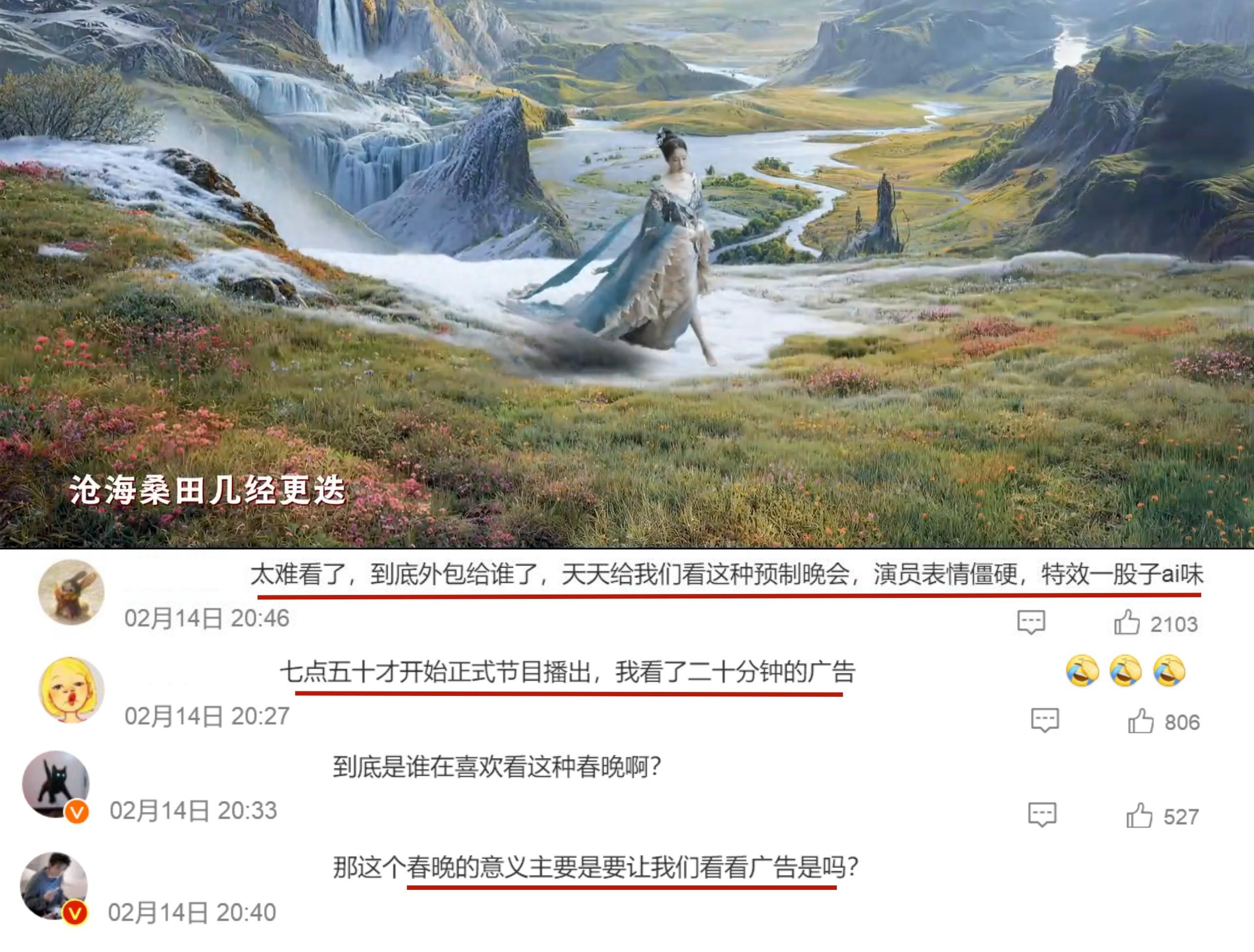 原本年年“出圈”的晚会,今年却被骂上热搜,被吐槽“大量广告里穿插了少量节目”,文化质感被严重稀释。