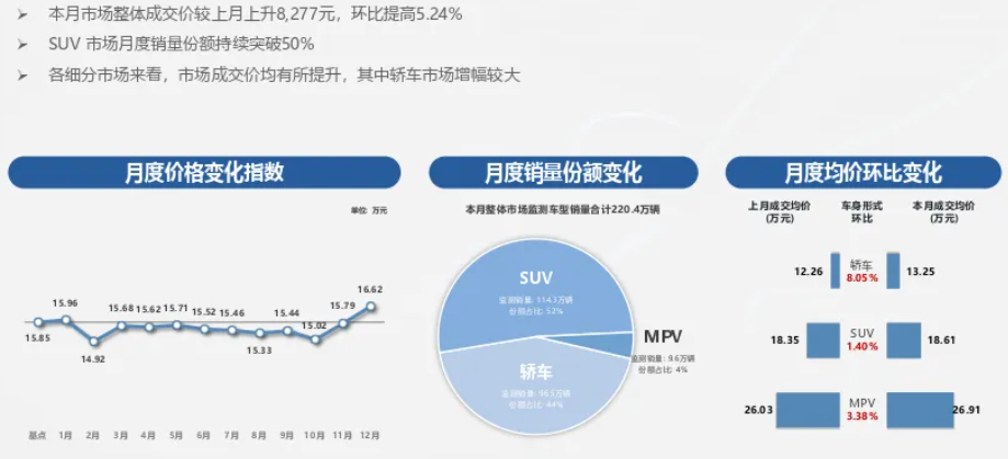 CARMAMA发现,12月所有车型均涨价,但涨幅差距极大,直接影响预算分配。轿车涨幅最猛,环比涨8.05%,均价从12.26万涨到13.25万,多花近万元;MPV涨3.38%,均价26.91万;SUV最温和,仅涨1.4%,均价18.61万。