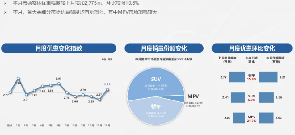 别慌,涨价被优惠对冲了不少,且车型间优惠差距悬殊。CARMAMA提醒,MPV是12月优惠赢家,优惠环比大增21.66%,平均优惠2.52万,赛那、岚图梦想家等热门车型优惠增幅超1.3万,销量也随之上涨。