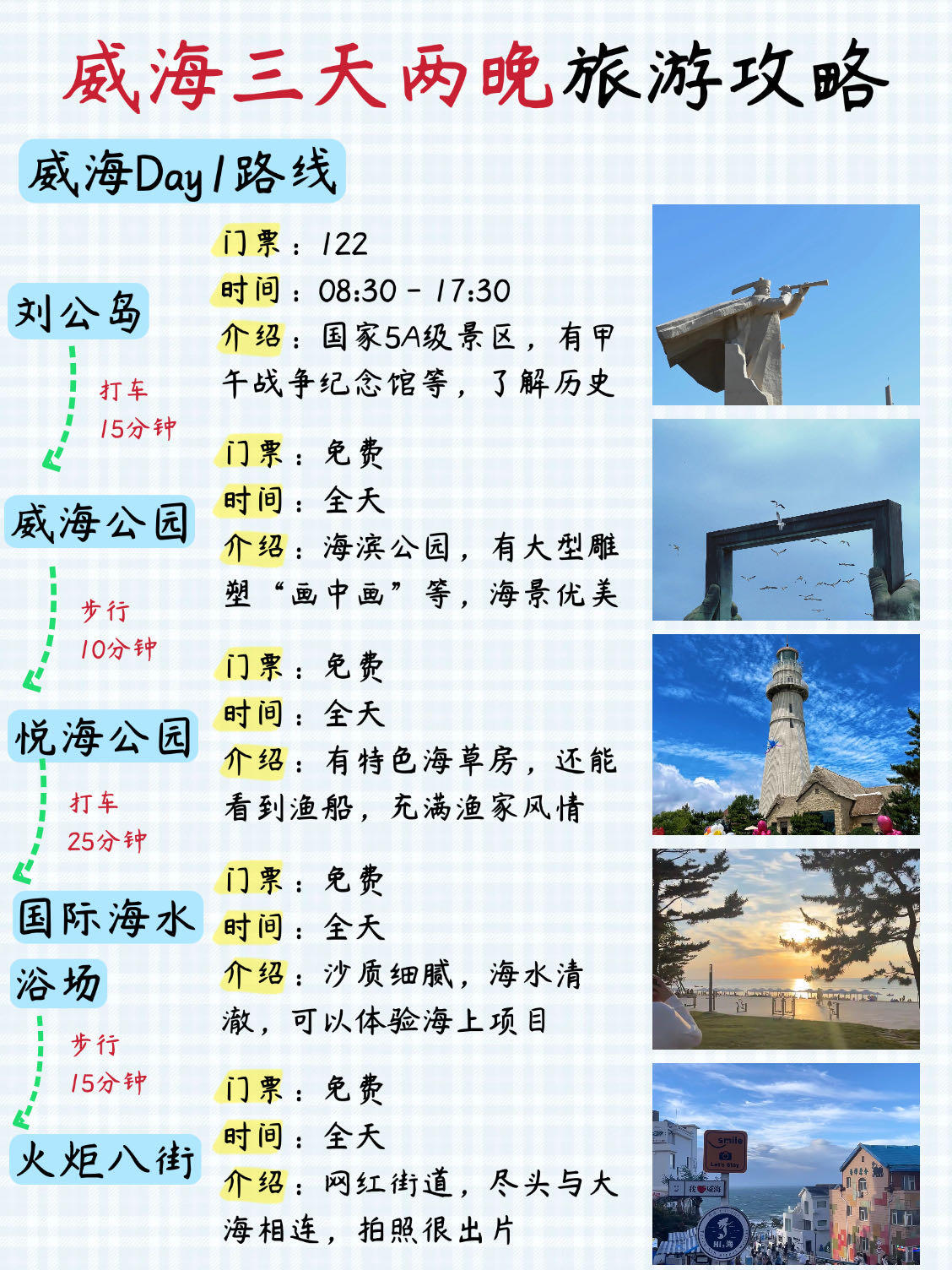 📍威海DAY1路线:刘公岛 ➡️ 威海公园 ➡️ 悦海公园 ➡️ 威海国际海水浴场 ➡️ 火炬八街