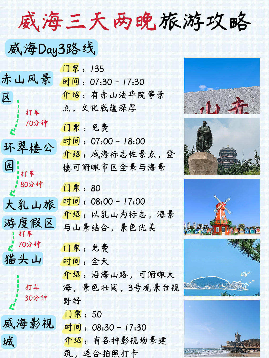 📍威海DAY3路线:赤山风景区 ➡️ 环翠楼公园 ➡️ 大乳山风景区 ➡️ 猫头山 ➡️ 威海影视城