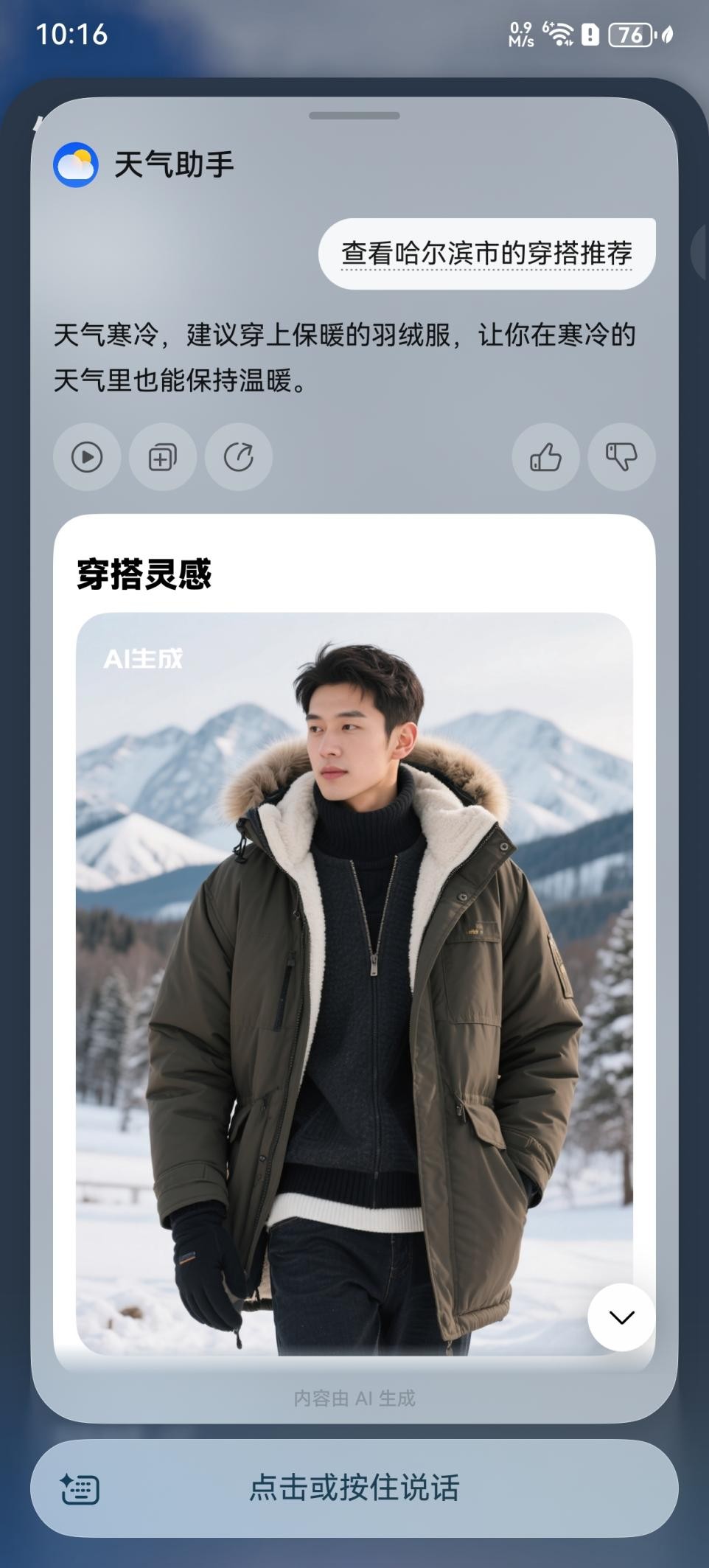 另外,如果你准备去北方滑雪,也可以直接让它生成对应的Look,只要发出指令,比如“查看哈尔滨市的穿搭推荐”,它就能结合当天气温给出一套既保暖又时尚的方案,简直就是手机里住了一位懂温度更懂风度的私人造型师。