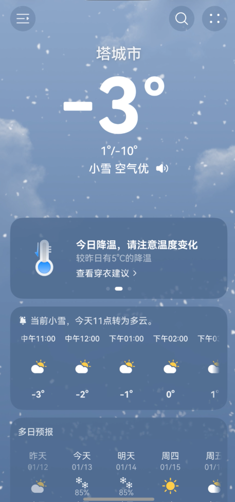 不过这两天我意外发现,手机里的华为天气藏着不少小心思,让查天气这件日常小事也变得生动起来。尤其是赶上下雪天打开它,摇一摇手机,屏幕上堆积的雪花竟然真的会被“抖”散;如果是下雨天,试着倾斜手机,屏幕上的雨滴也会顺着重力方向自然流动。