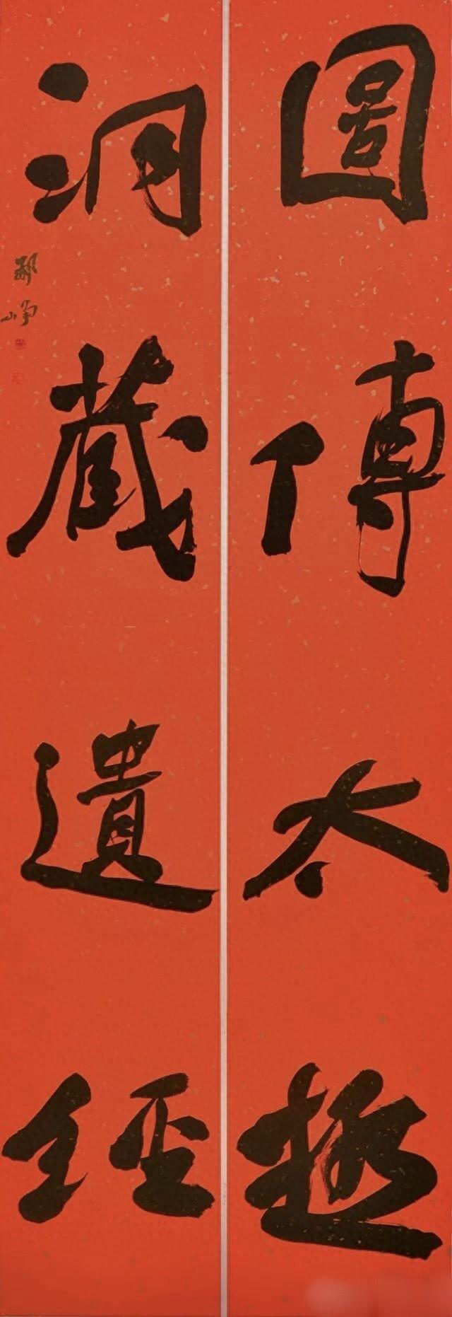 如上联第一字“图”,左竖往外弯曲,右竖向里收敛,有米芾的意韵,左右两竖构成了向背关系。第二字“传”,笔画左粗右轻,形态左短右长,中间留白,疏处似可走马。
