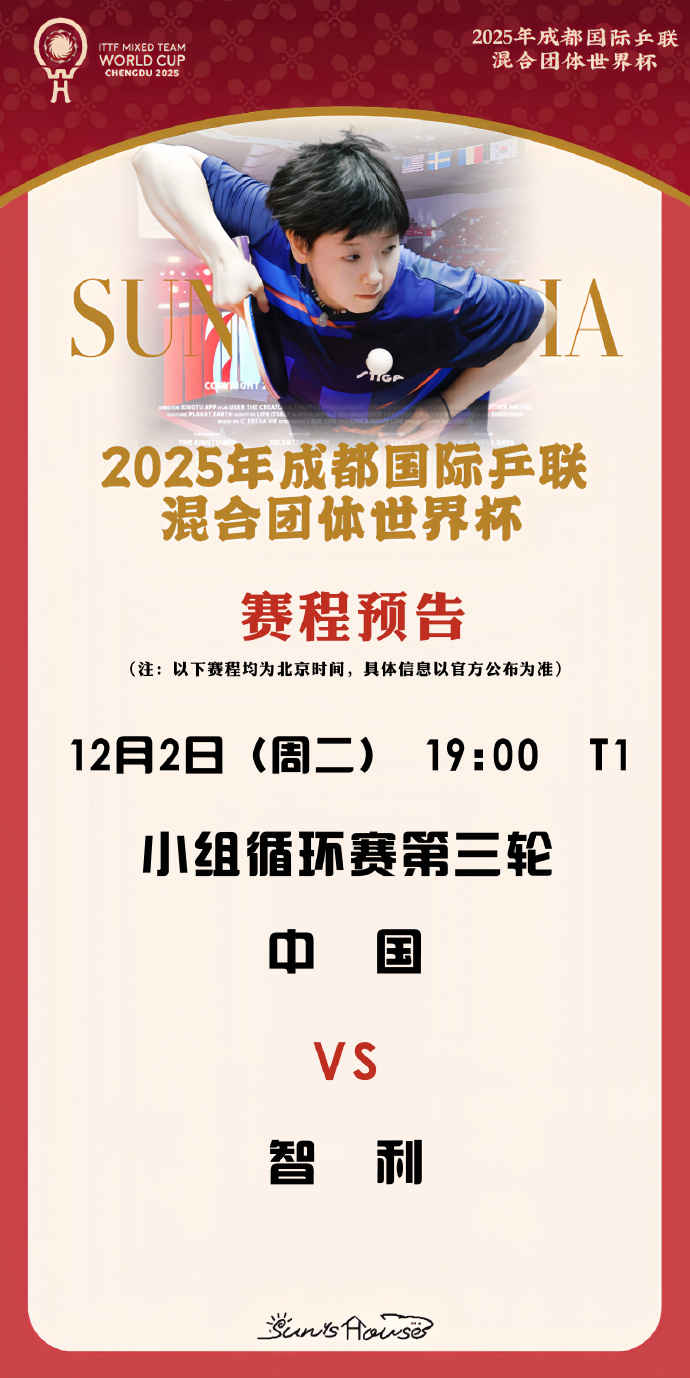 【12月2日赛事预告】项目:小组循环赛第三轮对阵:中国🇨🇳 vs 智利🇨🇱时间:2025年12月2日 19:00球台:T1