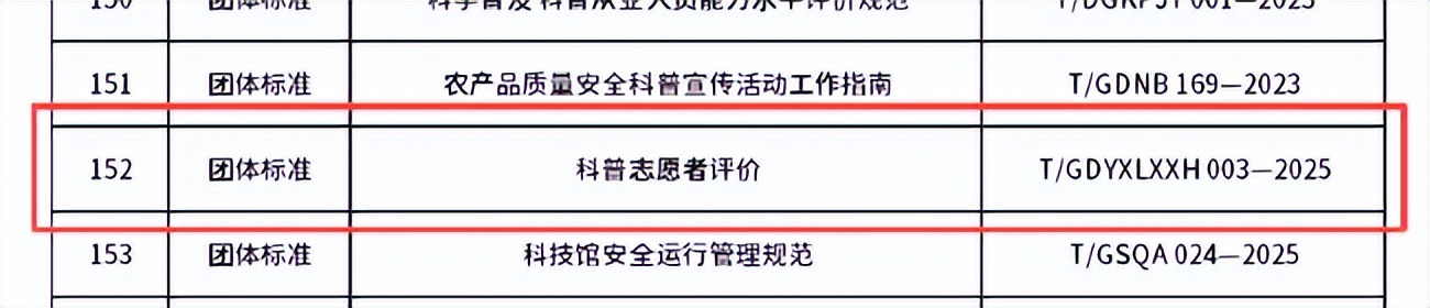 其中,由广东省科学技术普及志愿者协会、广东省研学旅行协会联合制定的团体标准(T/GDYXLXXH 003-2025)《科普志愿者评价》 成功入选名录。
