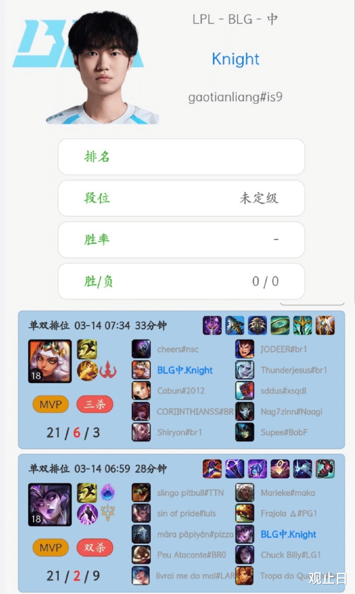 3月16日,先锋赛揭幕战,BLG将对阵BFX。Knight顶着“gaotianliang”的名字,能不能打出Tian当年那种“天神下凡”的气势?