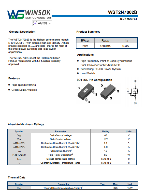 低导通损耗:VGS=10V时导通电阻仅1.8Ω,在300mA工作电流下压降540mV,导通功耗仅162mW,较传统小信号MOS降低35%。