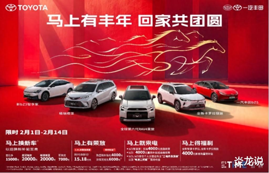 年味渐浓,归途可期。一汽丰田以一份诚挚礼遇,守护每个家庭的团圆之旅。2月1日至2月14日,一汽丰田推出限时活动,皇冠陆放、格瑞维亚等明星车型享至高20000元的置换补贴;全新第六代荣放限时焕新价15.18万元起,并可享4000元的购置税补贴和6000元的双保无忧礼;纯电“双子星”bZ3智享家和bZ5至高享4000元购车补贴和“三电终身质保”“电池三兜底”的服务权益;全新智混卡罗拉、全新卡罗拉锐放也可享4000元新春购置税补贴。
